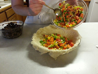 Pot pie is one of my favorite meals to make - right up there with soup.  You can use pretty much anything you have on hand and tailor the filling to the people who will eat it.  Sometimes I like to make individual pot pies for my family.  I put in the basics for the kids' filling, and then add onions, mushrooms, and spices for the adults.  Of course, you can make a vegetarian pot pie, but that's not really my family's thing, so I usually stick to the basics of beef, pork, or chicken.